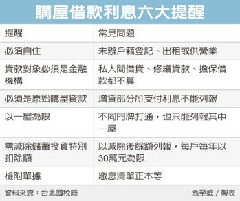 其次,國稅局指出,貸款對象必須是「金融機構」,不包含私人借貸,且這筆貸款必須以購買自用住宅為目的,過去常有民眾將修繕貸款、擔保借款也都列報,通通遭到國稅局剔除。