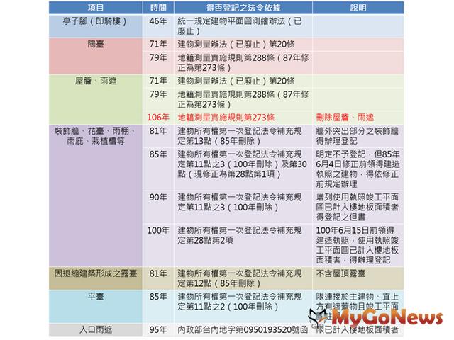 由於內政部最新修正發布的「地籍測量實施規則」刪除了屋簷、雨遮以附屬建物測繪的規定,因此也無法再辦理所有權第一次登記;但2018年1月1日前已申請建造執照,或都市更新事業計畫已報核,並依都市更新條例第61條之1第1項及第2項規定期限申請建造執照之建物,仍得以修正前規定辦理。也就是說,2018年1月1日前申請建造執照之建物,以及都市更新案件依上述都市更新條例相關規定,於2018年1月1日前已將都市更新事業計畫申請送件,並依期限申請建造執照者,不受這次法規變動的影響。