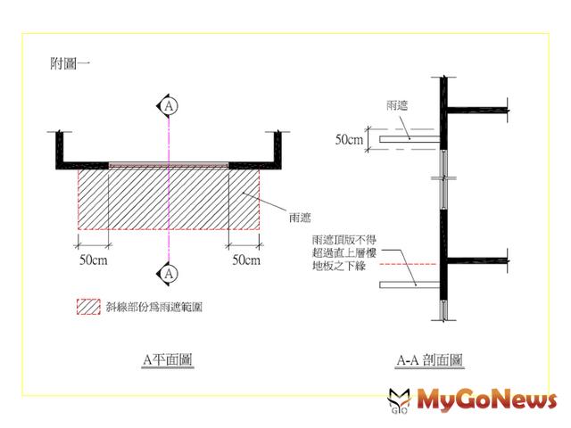 為了避免消費者買到這種實用上沒有太大效益的「虛坪」,內政部於2011年5月1日起實施預售屋「屋簷、雨遮登記不計價」措施,建商所提供之預售屋買賣定型化契約均應載明屋簷、雨遮不得計入買賣價格之條款;同時並於建築技術規則建築設計施工編中明定雨遮的形式(如圖1)。