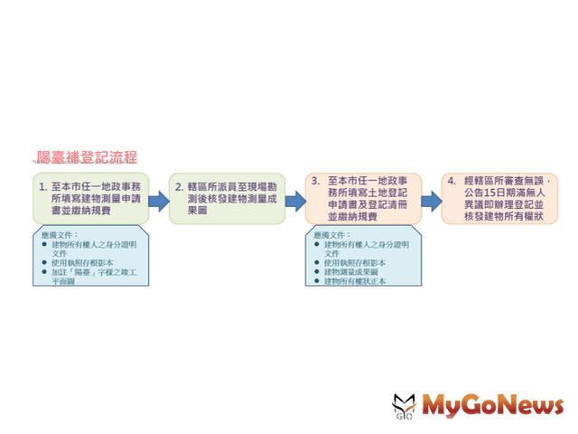 2018年1月1日後申請建造執照之建物,其屋簷、雨遮即無法再測繪及登記,但陽台仍屬可登記之標的;所以,已登記之建物,如果發現陽台面積未登記,民眾只要按著「先測量,再登記」的步驟(圖2),就可以補辦登記,拿到增加陽台面積的新權狀,不要讓自己的權利睡著囉!向地政事務所申請陽台補登記前,別忘了先向台北市建管處申請竣工平面圖上加註「陽台」喔!